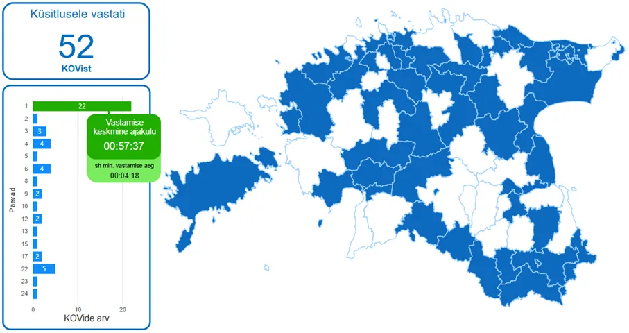 Kohalikud omavalitsused vastasid aktiivselt. Ankeedi täitis 52 omavalitsuse esindaja, mõnel juhul ka mitu inimest ühest omavalitsusest. Arvestades, et küsimustik oli pikk ja väga üksikasjalik, näitab see valmisolekut oma andmehalduse seisu kaardistada. Vastamisele kulunud aeg sõltus suuresti lisaks ülevaate omamisele asutuse andmehalduse olukorrast, nende kõrval ka igapäevased kohustused. Tõenäoliselt põletavamate päevakajaliste teemade puhul võis tekkida olukord, kus küsitlusele vastamisele oli võimalik keskenduda alles mitmete päevade möödumisel või jäi see üleüldse tegemata. Rõõmu pakub siiski näitaja, et suur osa vastanud kohalikest omavalitsustest täitis ankeedi ära ühe päeva jooksul keskmiselt 57 minutiga. Korduvuuringu puhul tõenäoliselt vastamise aeg väheneb, sest eelnevalt on olemas piisav ülevaade ja keskenduda saab küsimustele ning näitajatele, mis aja jooksul on muutunud.