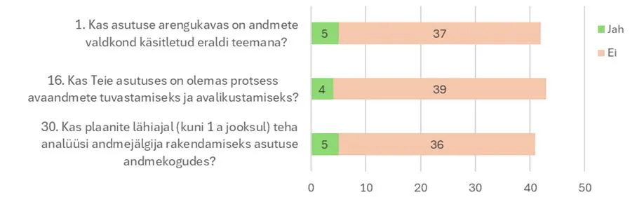 Just selleks, et saada realistlik ülevaade Eesti organisatsioonide andmete valdkonna hetkeseisust, viis Justiits- ja Digiministeerium koostöös Statistikaametiga 2025. aasta märtsis ja aprillis läbi ankeetküsitluse. Küsimustik oli Statistikaameti küsitluste keskkonnas, mis võimaldas seda korduvalt avada ning vastuseid vajadusel täiendada ja muuta. Küsitlus saadeti 152 asutusele, sealhulgas kõigile kohalikele omavalitsustele.