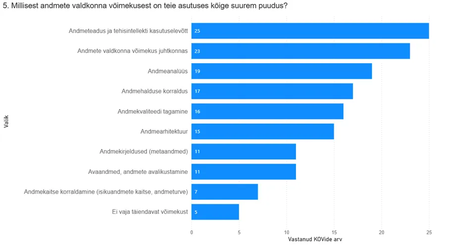 Asutusesisese võimekuse vajaduse hindamisel näevad kohalikud omavalitsused kõige suuremat vajadust andmeteaduse ja tehisintellekti kasutusele võtmise järele. Suure murekohana toodi välja ka andmete valdkonna võimekust juhtkonnas ja andmeanalüüsi võimekust organisatsioonis tervikuna. Andmete avalikustamise ja andmekaitsega seonduva võimekuse parandamise järele võrreldes eelnevaga samaväärset vajadust ei nähtud.